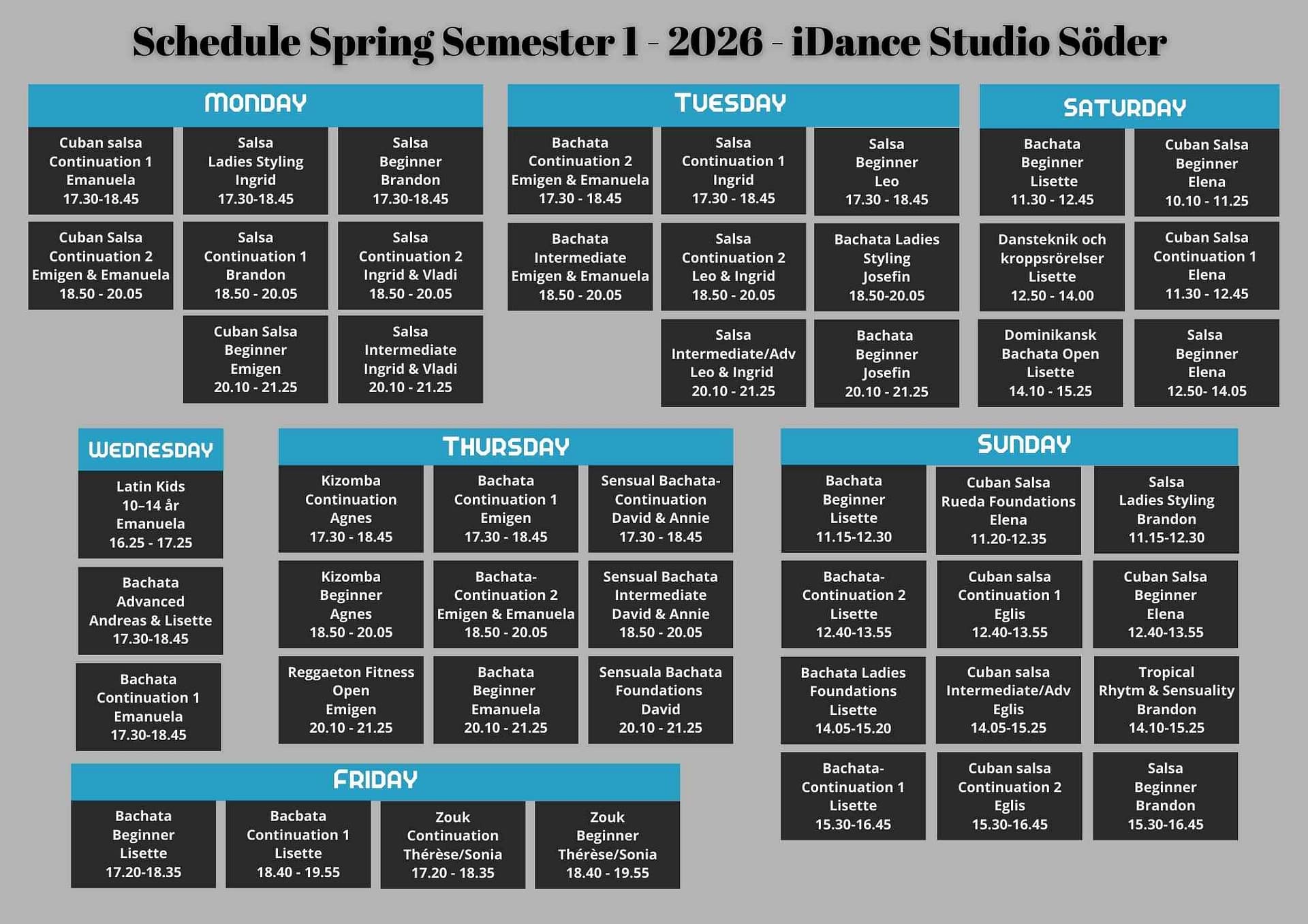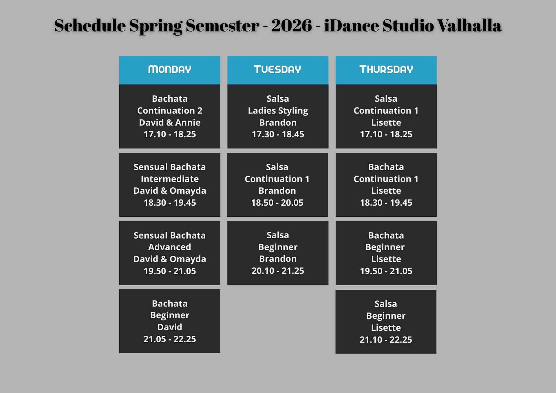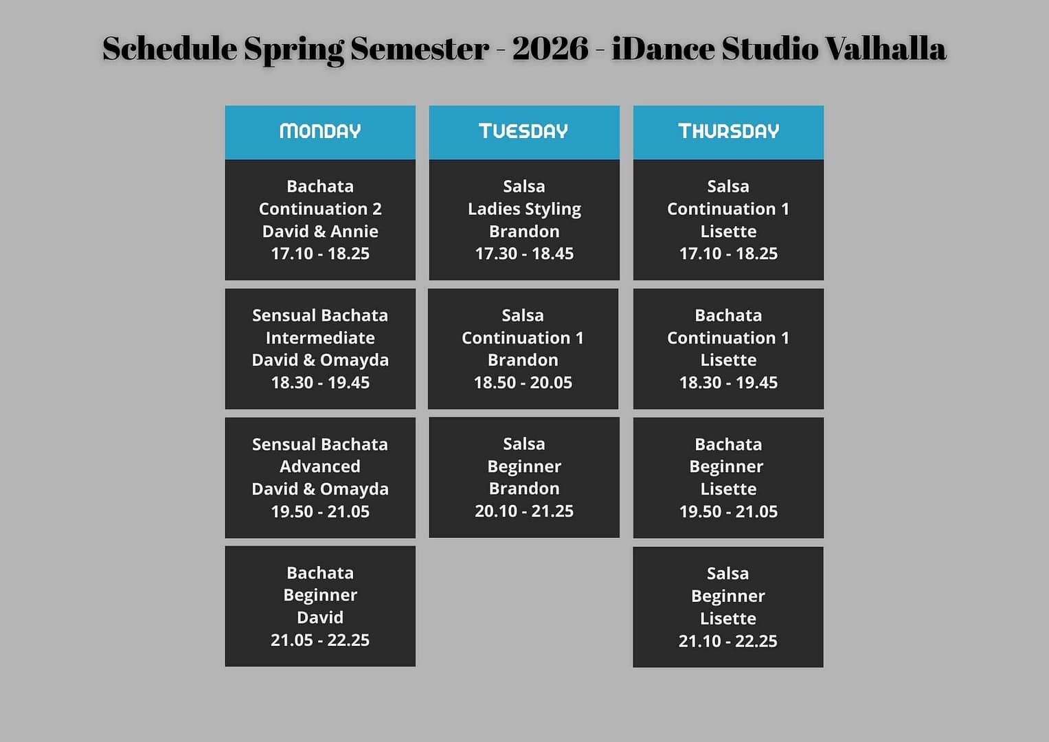 Salsa, Bachata and Kizomba Schedule Spring semester 1 – 2026